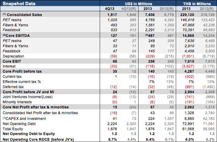Mr. Aloke Lohia, Group CEO of Indorama Ventures said, “2013 was a tough year for the industry; our differentiation and low cost strategy has provided us with superior margins compared to many of our peers. Our volume and geographic diversification continues to outperform our peers. We have moved further into a horizontal integration strategy through the acquisition and development of High Value Add (HVA) products that are now providing excellent returns. IVL’s HVA segment contributed 19% of production, 27% of revenues and 34% of Core EBITDA in 2013 as these products continued to impress global brands. The acquisition of FiberVisions in 2012 gave us the lead in the hygiene sector and now the recent announcement of the acquisition of PHP Fibers in Germany gives us the lead in technological yarns used in the airbag and tire cord business segments,” Lohia said.